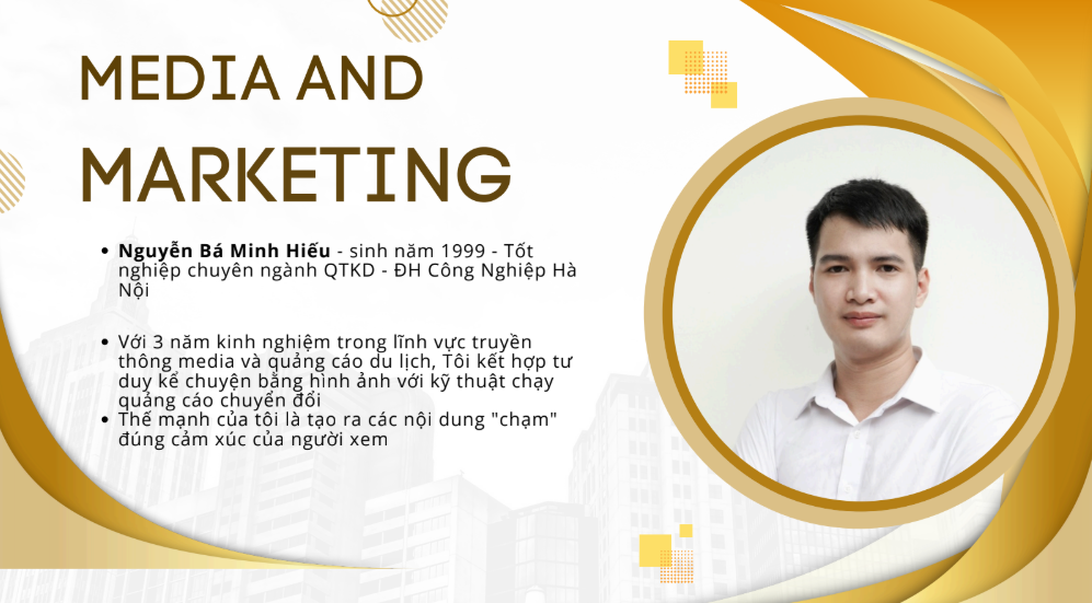 - Với 3 năm kinh nghiệm trong lĩnh vực truyền thông media và quảng cáo du lịch , Tôi kết hợp tư duy kể chuyện bằng hình ảnh với kỹ thuật chạy quảng cáo chuyển đổi.